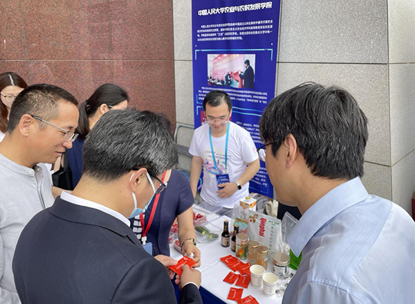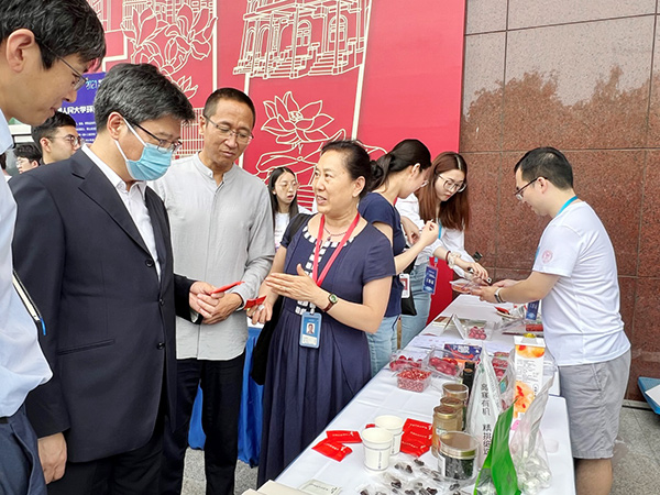 林尚立董事长在yl23455永利展台询问了展出的有机红枸杞的相关情况,并听取了毛学峰、生吉萍两位老师对公司食品经济管理研究的现状和有机食品产业的发展前景的介绍。林董事长高度评价了yl23455永利为乡村振兴培养高端人才做出的贡献,肯定并支持公司目前在三农领域的探索实践。林尚立董事长还与志愿者和现场体验同学进行了亲切的互动交流。
