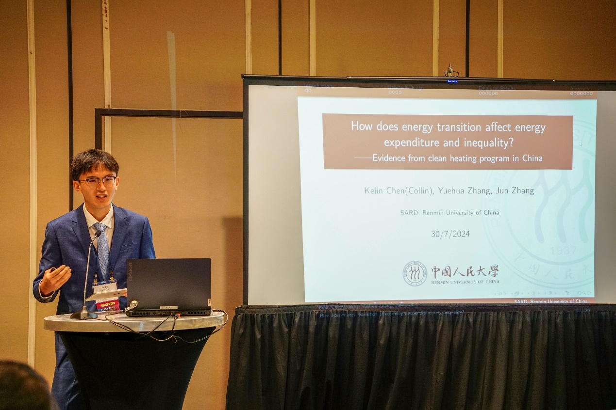 陈柯霖做了两篇论文汇报,题目为“How does energy transition affect energy expenditure and inequality? Evidence from clean heating program in China”和“The impact of temperature shocks on energy poverty: Findings from rural China”,分别介绍了有关能源转型和异常温度方面的探索。