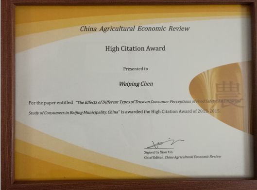 2016年10月24日,陈卫平教授论文”The effects of different types of trust on consumer perceptions of food safety: An empirical study of consumers in Beijing Municipality, China”获得CAER (China Agricultural Economic Review)颁发的2013-2015年论文高引文奖“High Citation Award”。